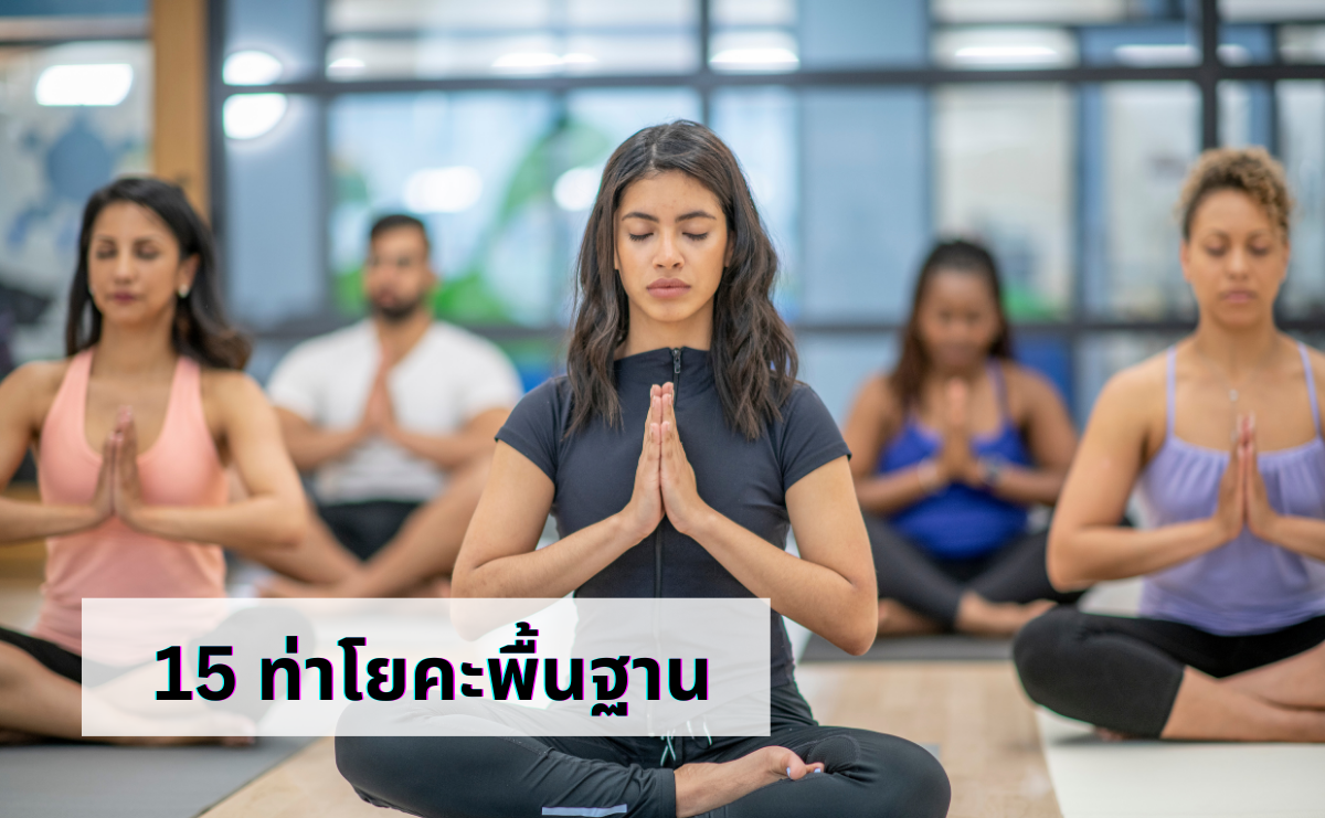 โยคะเบื้องต้นมี 15 ท่าพื้นฐาน แบ่งเป็นท่ายืน 5 ท่า ท่านั่ง 5 ท่า และท่านอน 5 ท่า เหมาะสำหรับผู้เริ่มต้นฝึก