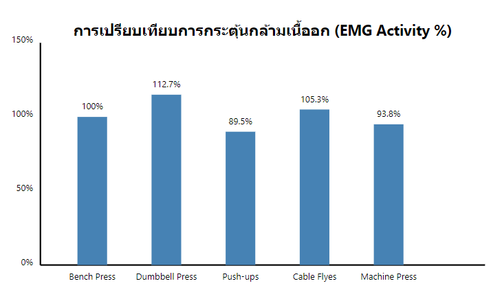 จากการวัดค่า EMG พบว่า dumbbell bench press กระตุ้นกล้ามได้มากถึง 112.7% รองลงมาคือ incline dumbbell press ที่เน้นอกส่วนบน และ dumbbell flyes ที่ช่วยเพิ่มระยะการเคลื่อนไหวได้มากกว่าท่าอื่น