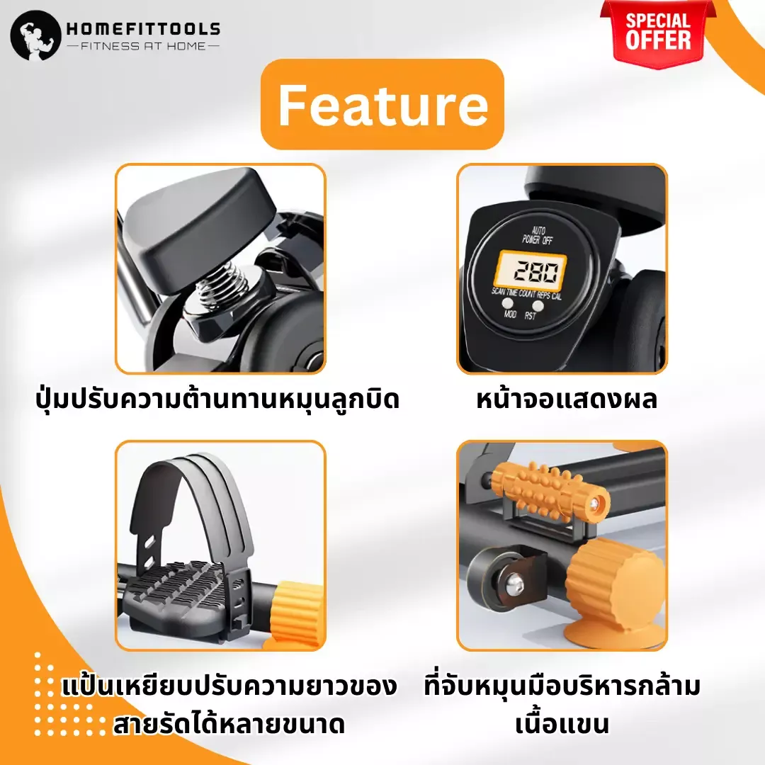 A: ไม่ใช้ครับ เป็นระบบแรงกล แบบหมุนด้วยมือและเท้า ปลอดภัย ไม่ต้องเสียบปลั๊ก