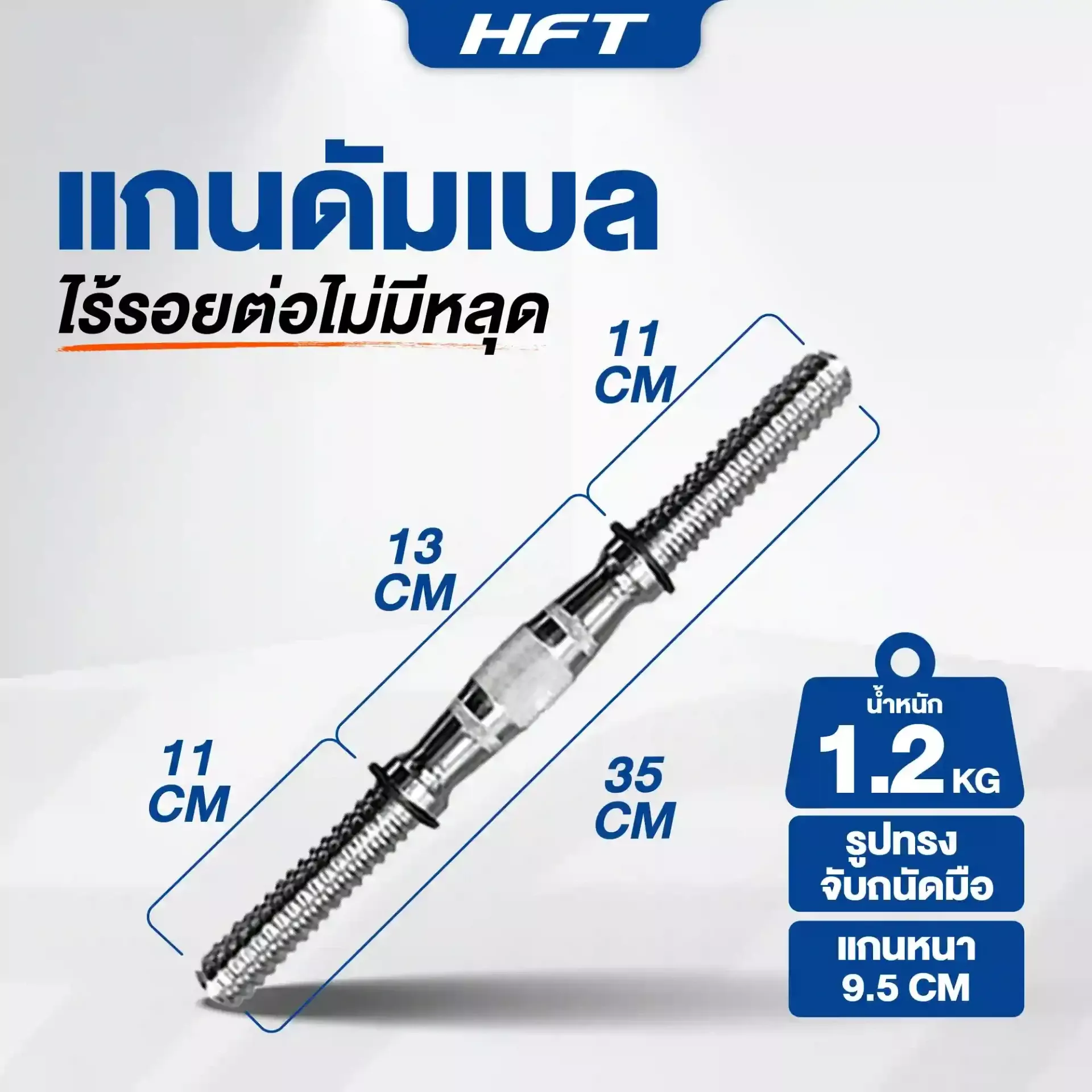 • แกนดัมเบล 2 ชิ้น น้ำหนักต่อชิ้น 1.2 กิโลกรัม น้ำหนักรวมเป็น 2.4 กิโลกรัม