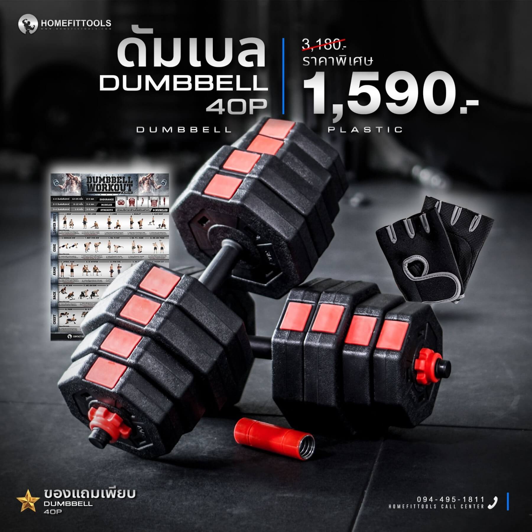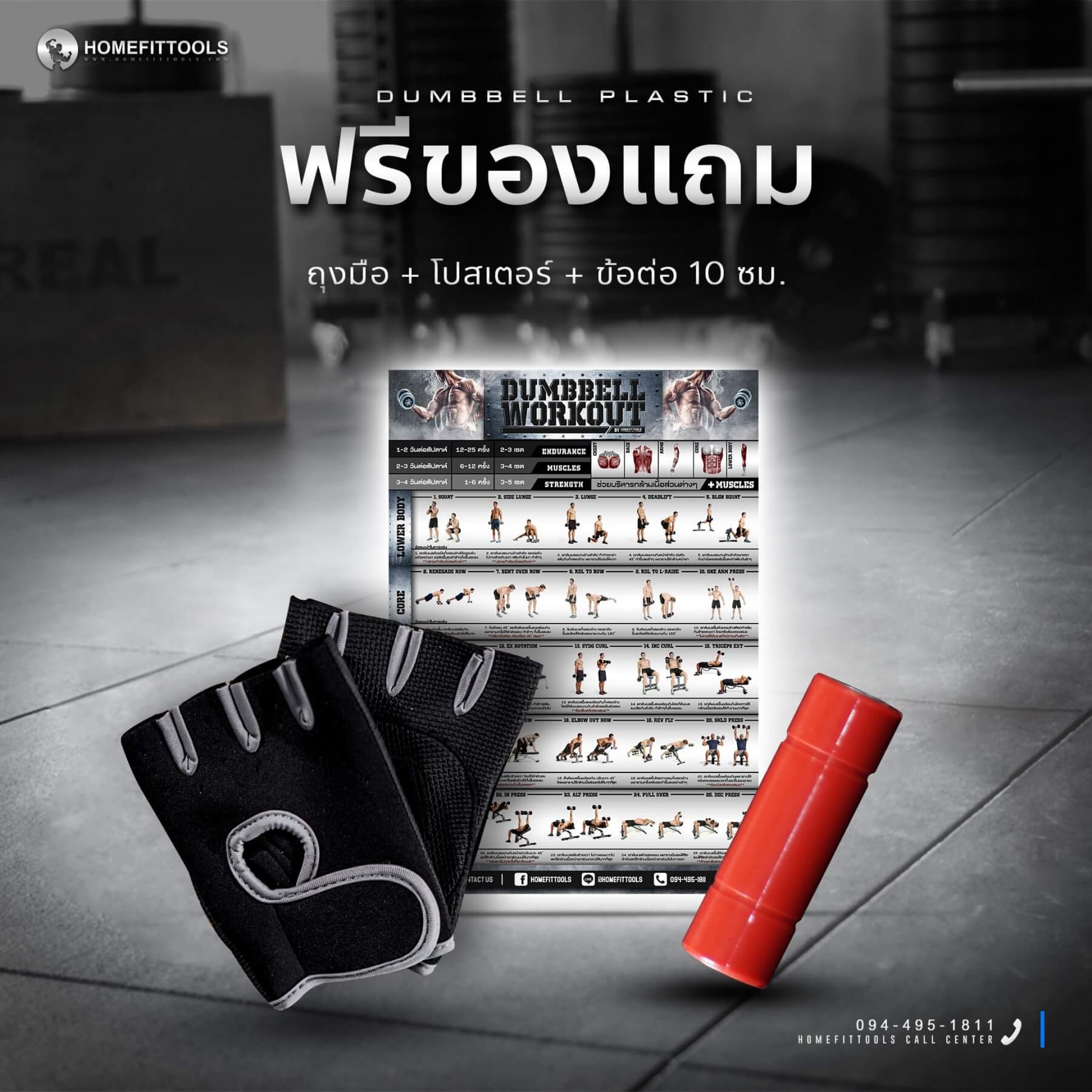 - ถุงมือยกน้ำหนัก (แถมฟรี) เพื่อป้องกันมือด้านและลดการลื่นหลุด