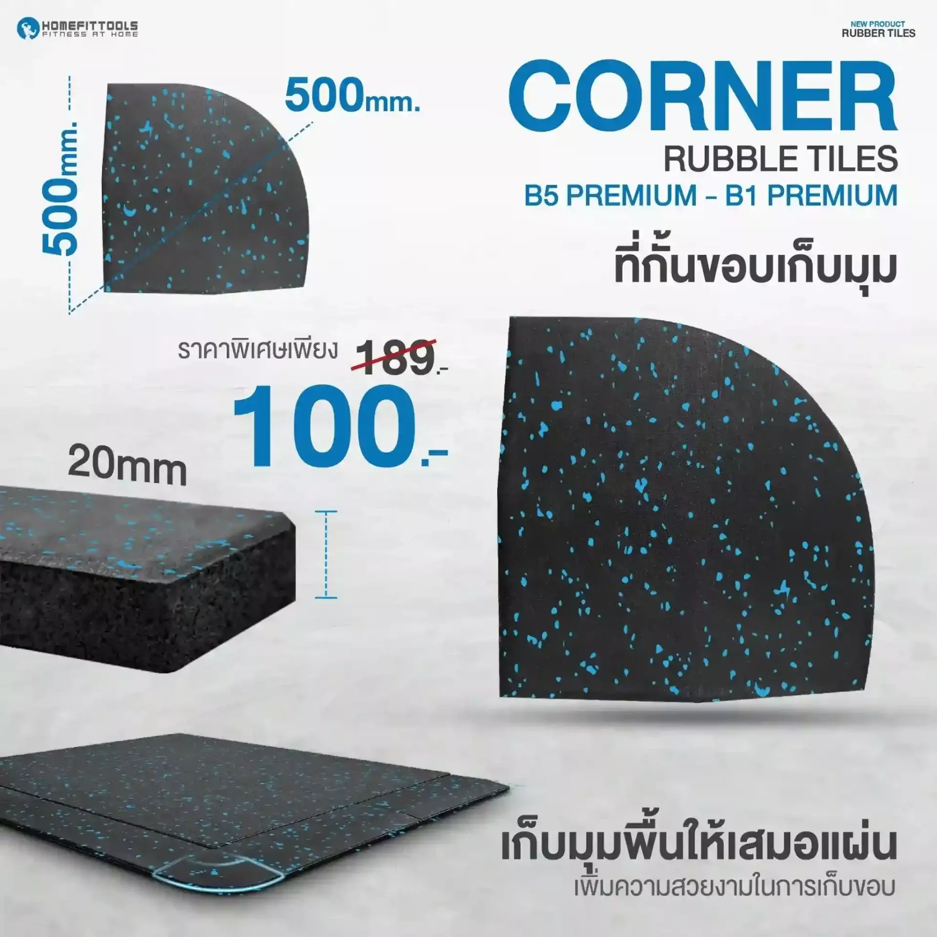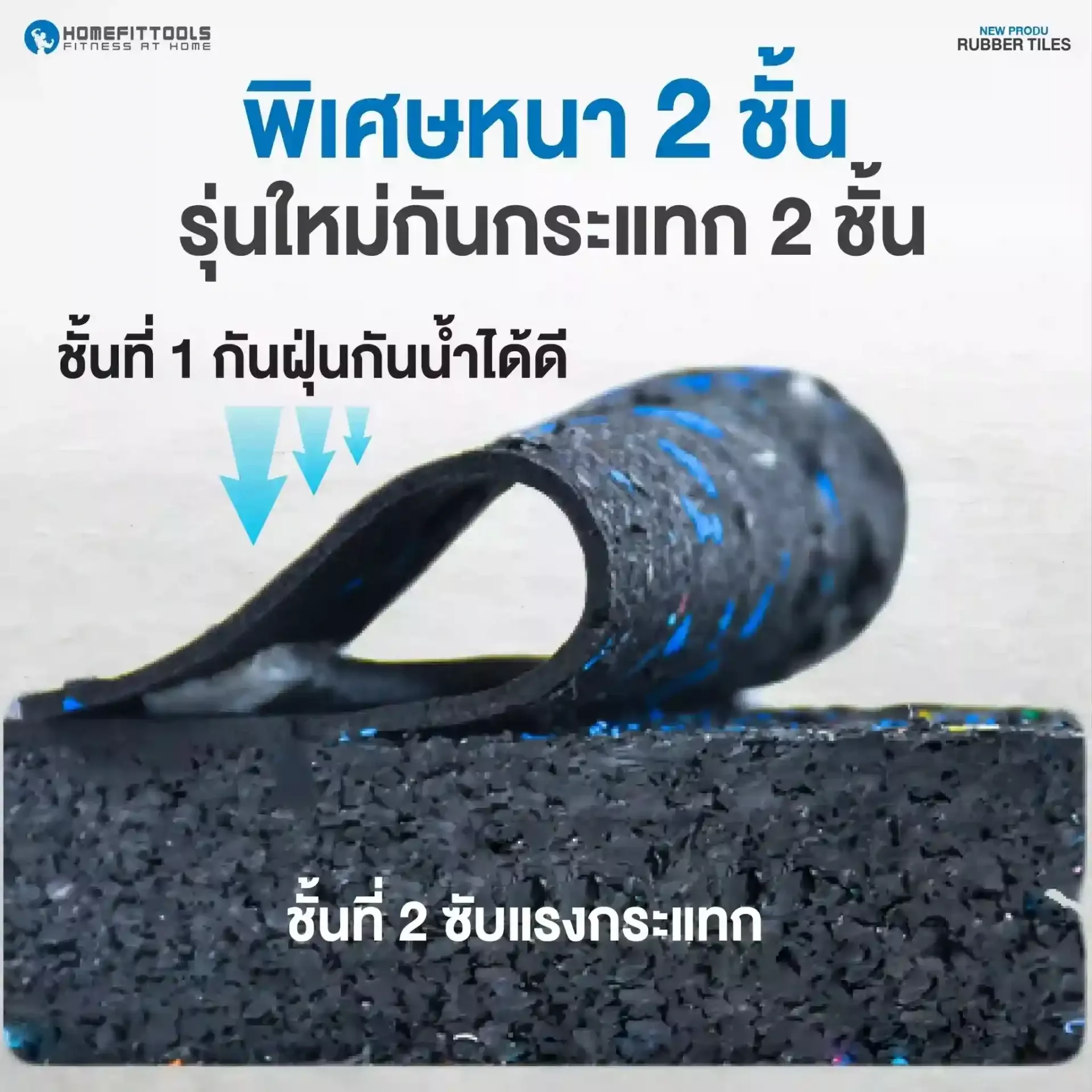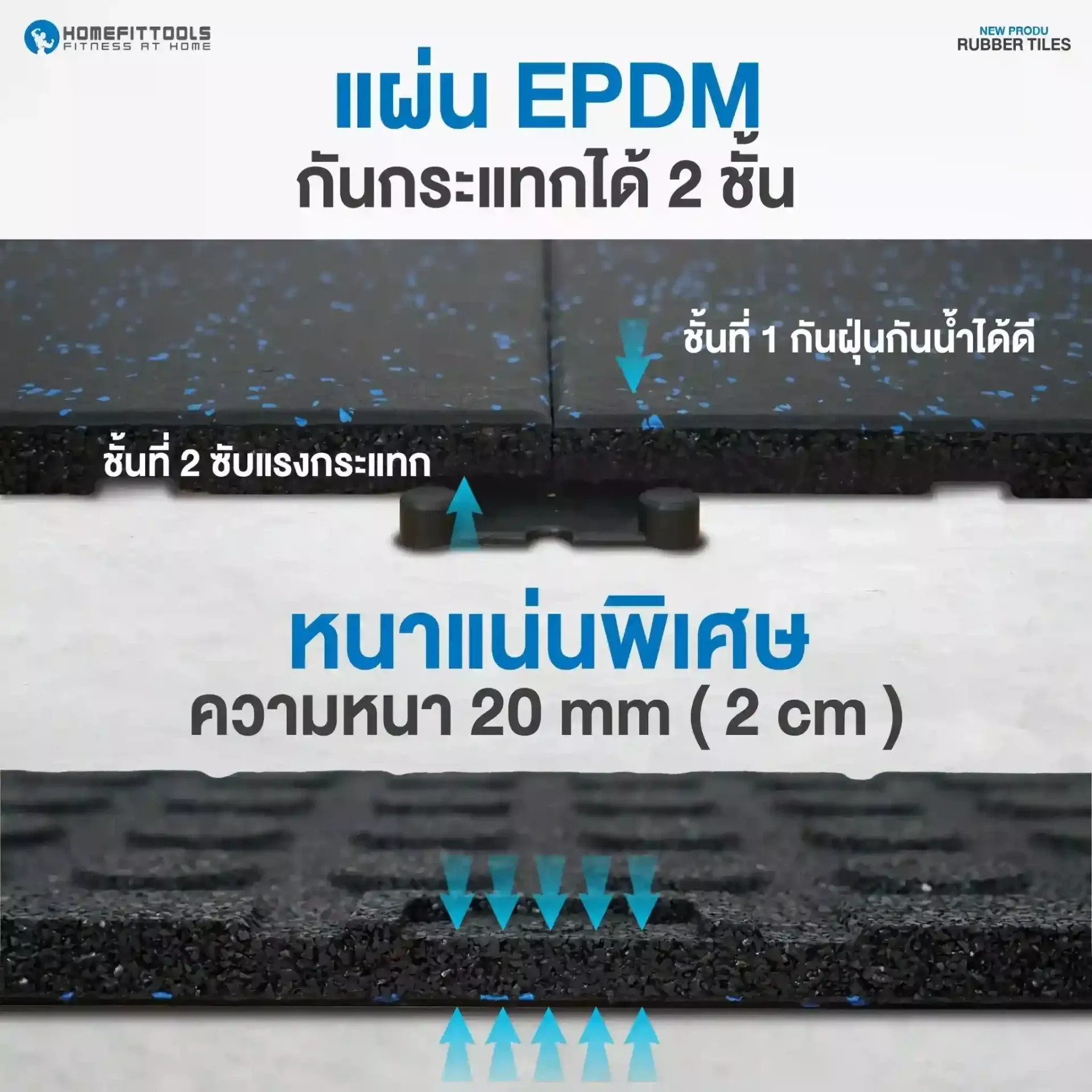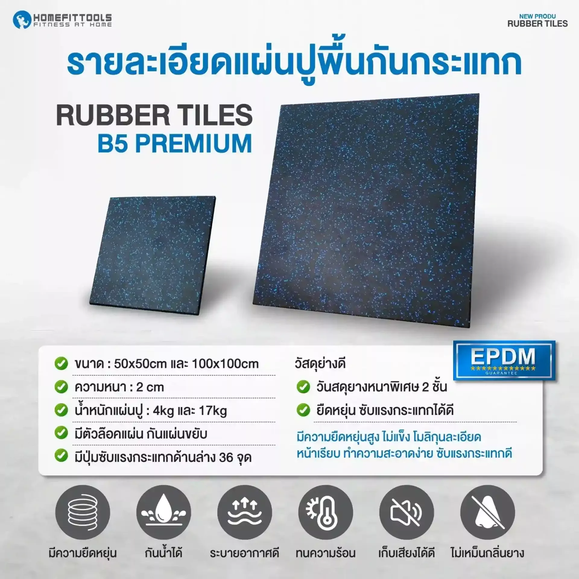 แผ่นปูพื้นกันกระแทก B5 Premium หนา 2 ซม. ผลิตจาก ยาง EPDM คุณภาพสูง 2 ชั้น รองรับแรงกระแทกและลดเสียงรบกวนได้ดี ขนาด 50x50 ซม. พร้อม ปุ่มซับแรงกระแทก 256 จุด ช่วยให้การยึดเกาะพื้นแน่น ไม่ลื่น และไม่ต้องใช้กาว เหมาะสำหรับ ฟิตเนส ห้องยกน้ำหนัก และพื้นที่ออกกำลังกาย ที่ต้องการแผ่นปูพื้นที่แข็งแรง ทนทาน และติดตั้งง่าย