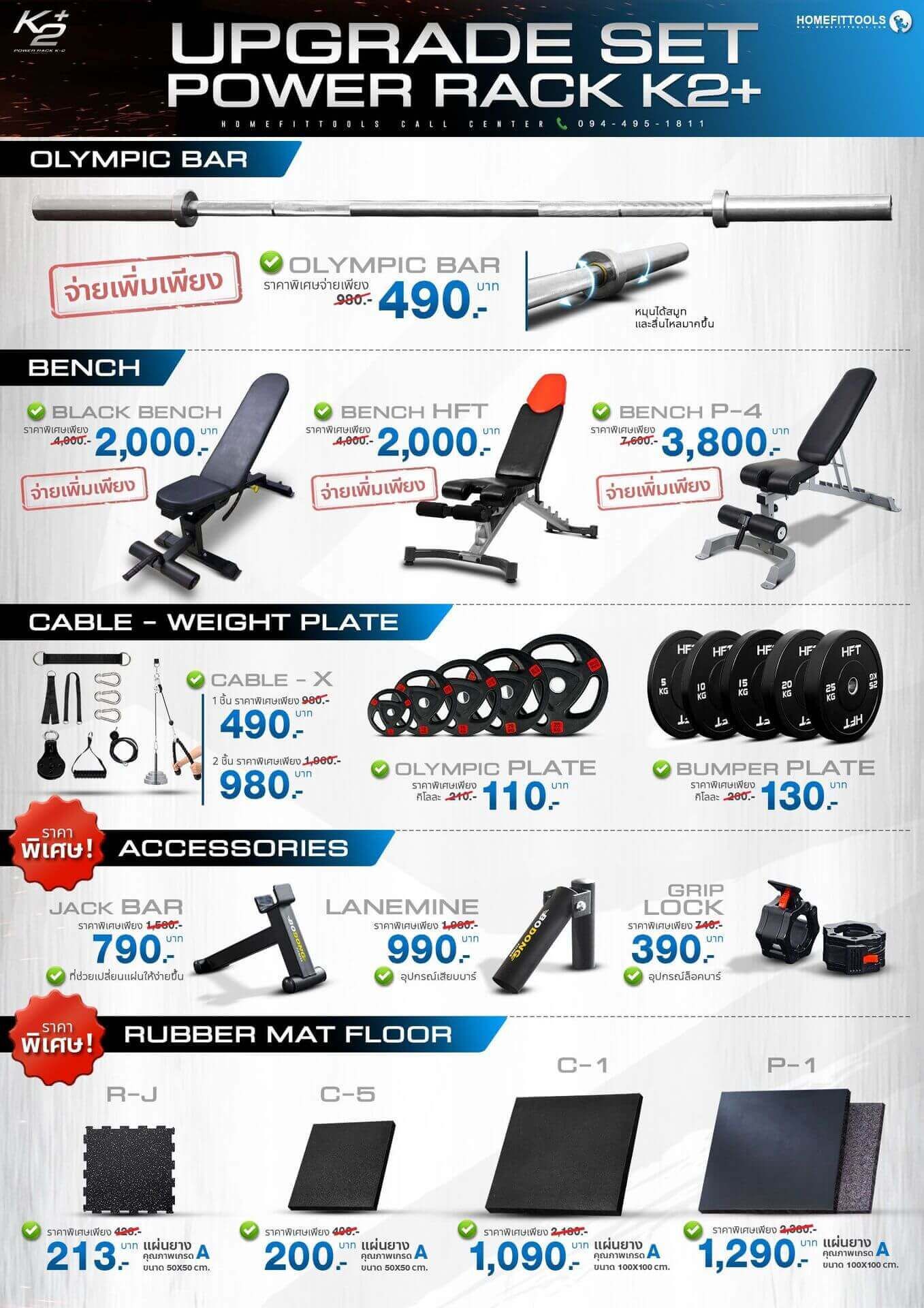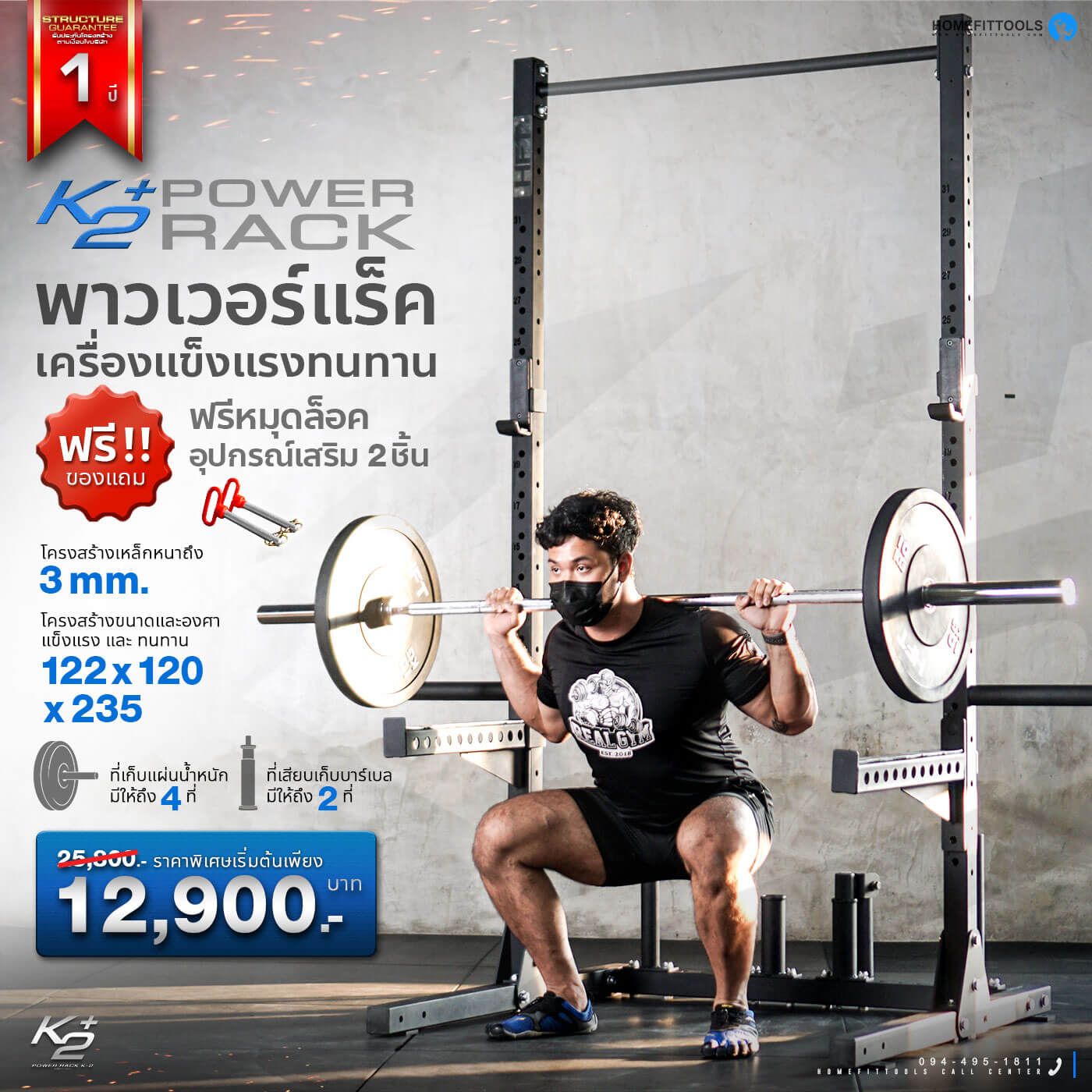 พาวเวอร์แรค รุ่น K2+ สามารถเล่นฟรีเวท สควอช บอดี้เวทคอสฟิต เคเบิ้ลสเตชั่น และมีที่เก็บแผ่น และที่เก็บบาร์ ฟังค์ชั่นครบ แถมใช้เนื้อที่น้อย โครงสร้างหนา 3 มิลลิเมตร หนาเท่าในฟิตเนส มีสีเคลือบกันรอย และกันสนิมได้เป็นอย่างดี เจฮุกแบบเซฟตี้ ล็อคแน่นไม่มีเด้ง ฮาฟแร็คยาวพิเศษถึง 60 เซนติเมตร ปรับเปลี่ยนสูงต่ำได้มากถึง 31 ระดับ รับน้ำหนักได้มากถึง 250 กิโลกรัม ตัว Pull Up ปรับได้สูงถึง 225 เซนติเมตร ปรับขึ้นลงได้ทุกระดับ ตั้งแต่สูงสุด จนล่างสุด เพื่อให้เหมาะกับการใช้งานทุกรูปแบบ ติดตั้ง Cable X ทำให้เป็น Cable Station ทำให้สามารถเล่นได้ทั้ง Seated Row / Lat Pulldown / Fly และท่าอื่น ๆ อีกมากมาย ที่เก็บแผ่นน้ำหนักและที่เก็บบาร์ สามารถปรับเปลี่ยนรูปแบบการติดตั้ง ได้หลากหลายรูปแบบ ไม่ว่าจะเป็นแบบติดตั้งไว้ด้านล่าง หรือจะติดไว้ด้านข้าง สามารถใช้งานร่วมกับ Landmine ได้ด้วย