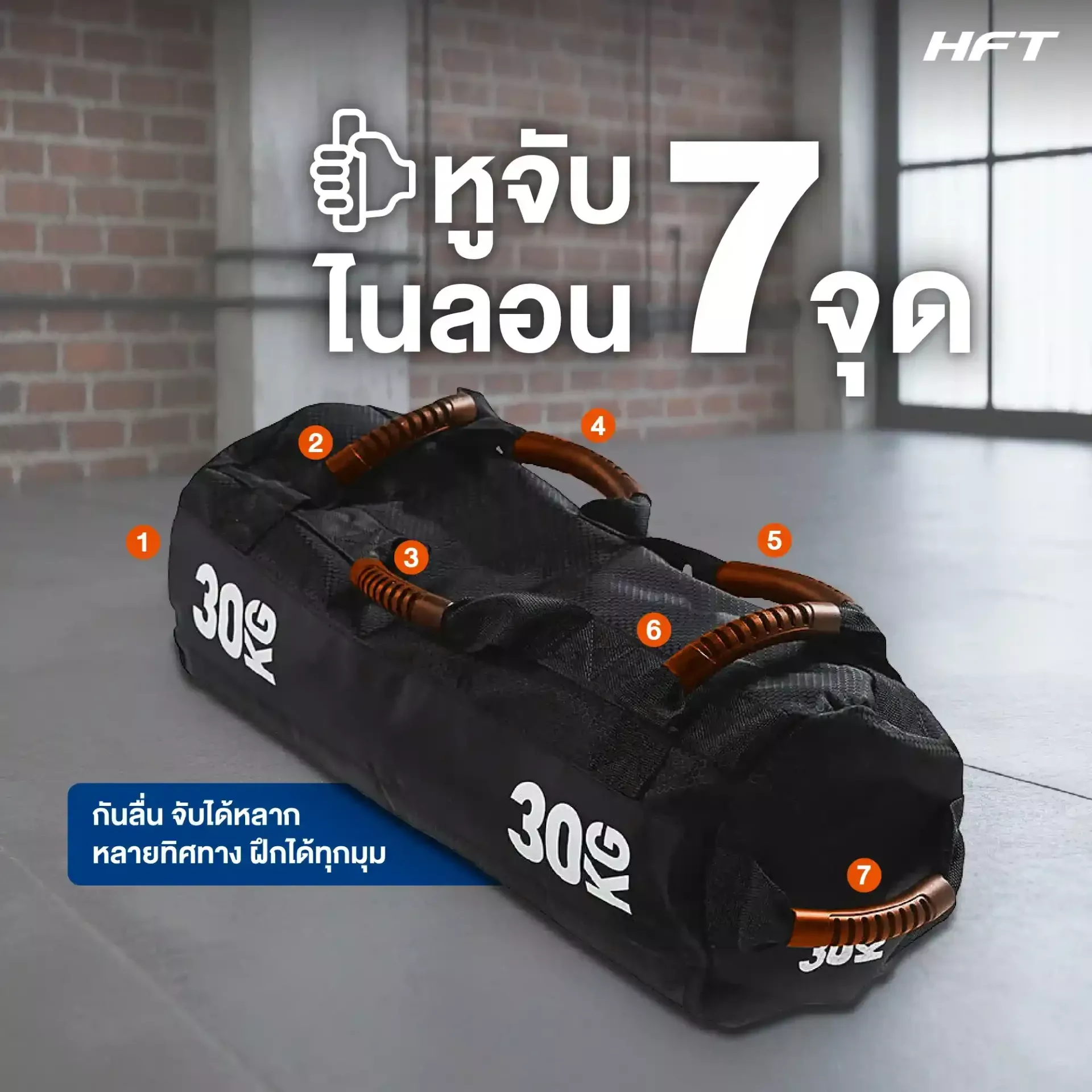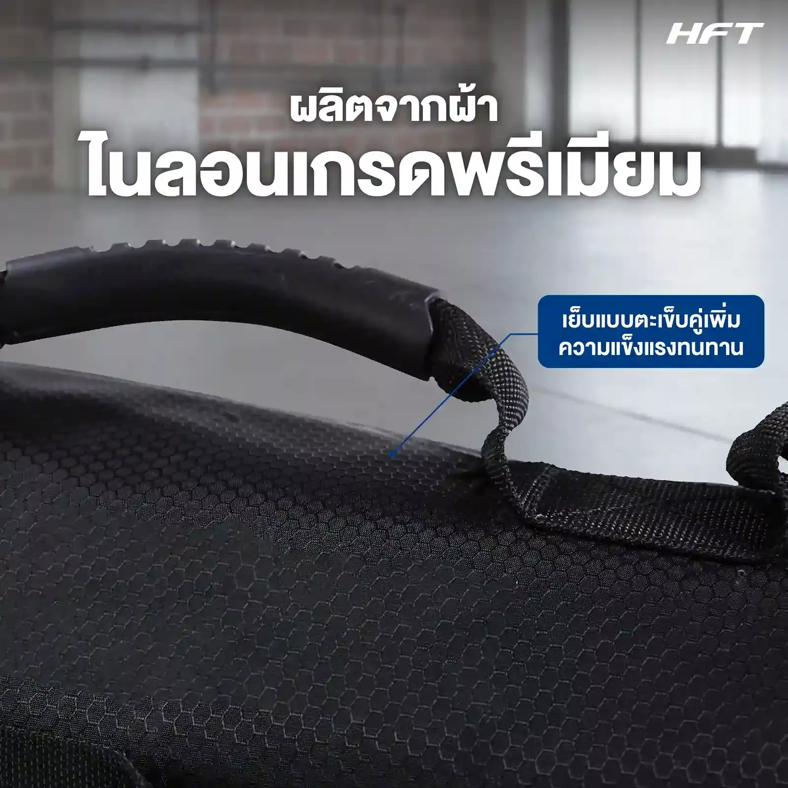 ตัวกระสอบผลิตจาก ผ้าเกรดพรีเมียมคุณภาพสูง ทนทานต่อแรงกระแทก การฉีกขาด และการเสียดสี พร้อมตะเข็บเย็บคู่ (Double-Stitched) เพื่อความทนทานในระดับเกรดฟิตเนส (Commercial Grade) มาพร้อม หูจับไนลอนกันลื่น 7 จุด ที่จัดวางในตำแหน่งเหมาะสม ช่วยให้สามารถเปลี่ยนท่าฝึกได้หลายรูปแบบ ทั้งท่าดัน ยก หมุน เหวี่ยง หรืออุ้มในแนวต่าง ๆ