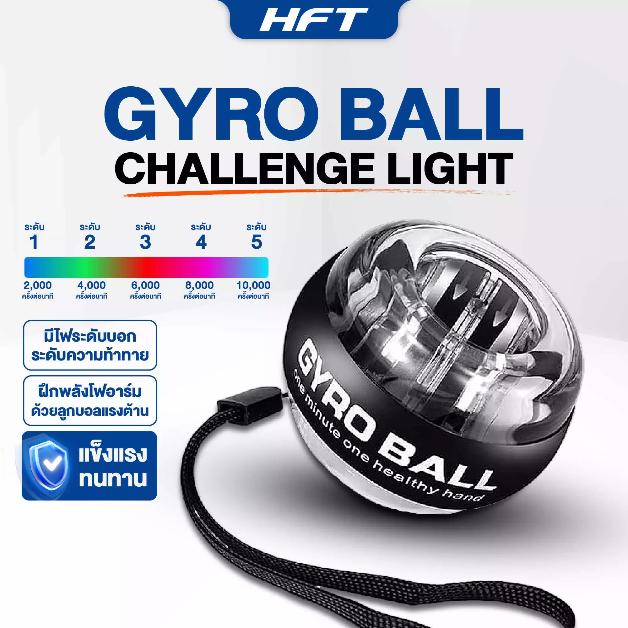 Gyro Ball Challenge Light คือชุดลูกบอลที่ออกแบบสำหรับการฝึกแบบมี Progression มี 5 สีซึ่งสื่อระดับแรงต้าน/ความท้าทาย (เช่น เบา → กลาง → หนัก) เพื่อให้ผู้ใช้สามารถปรับโปรแกรมฝึกแบบเป็นขั้นตอน (progressive overload) ได้ อย่างเป็นระบบ ตั้งแต่การฝึกเพื่อป้องกันอาการล้าจนถึงการเพิ่ม Grip Strength สำหรับนักกีฬาที่ต้องการ performance improvement ตัวลูกบอลยังคงโครงสร้างวัสดุทนทานและขนาดมาตรฐานเพื่อความคงที่ในการจับและสัมผัส