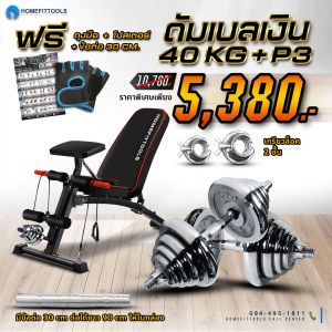 เซ็ทม้านั่งปรับระดับ P3 ดัมเบล 40 Kg. ไม่มีกล่อง แถมฟรีข้อต่อ และถุงมือ