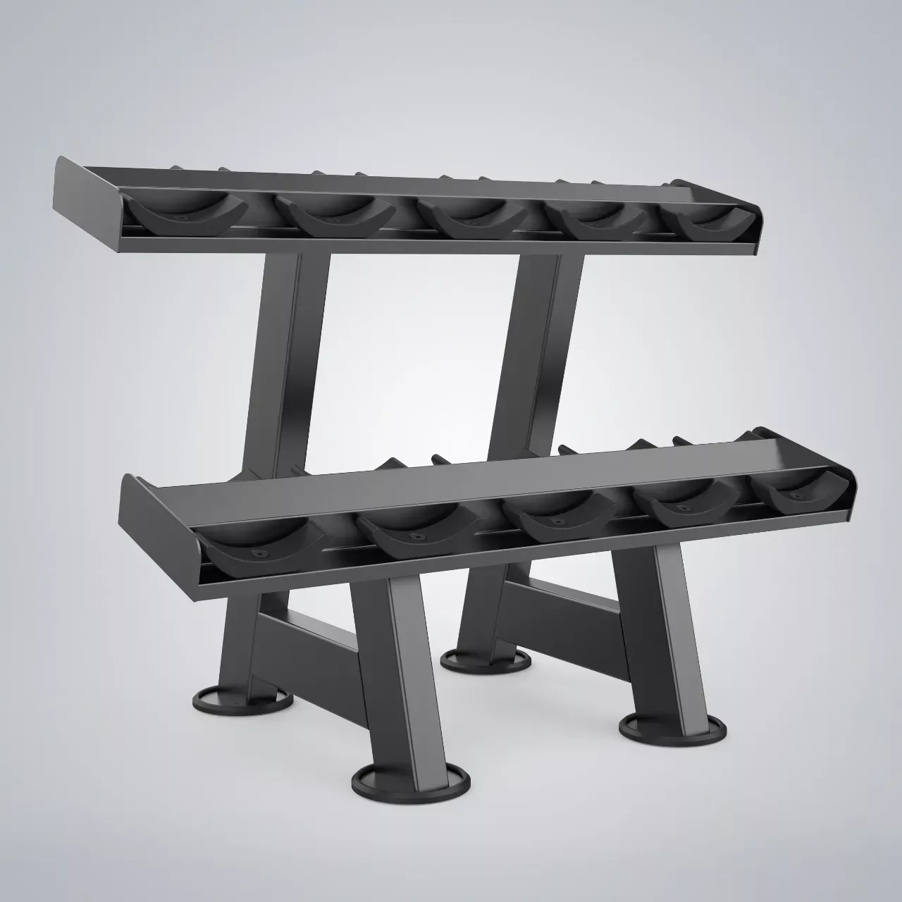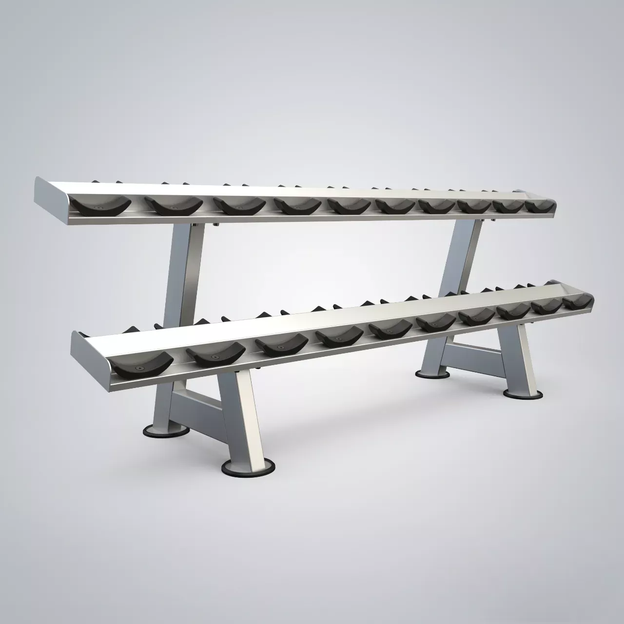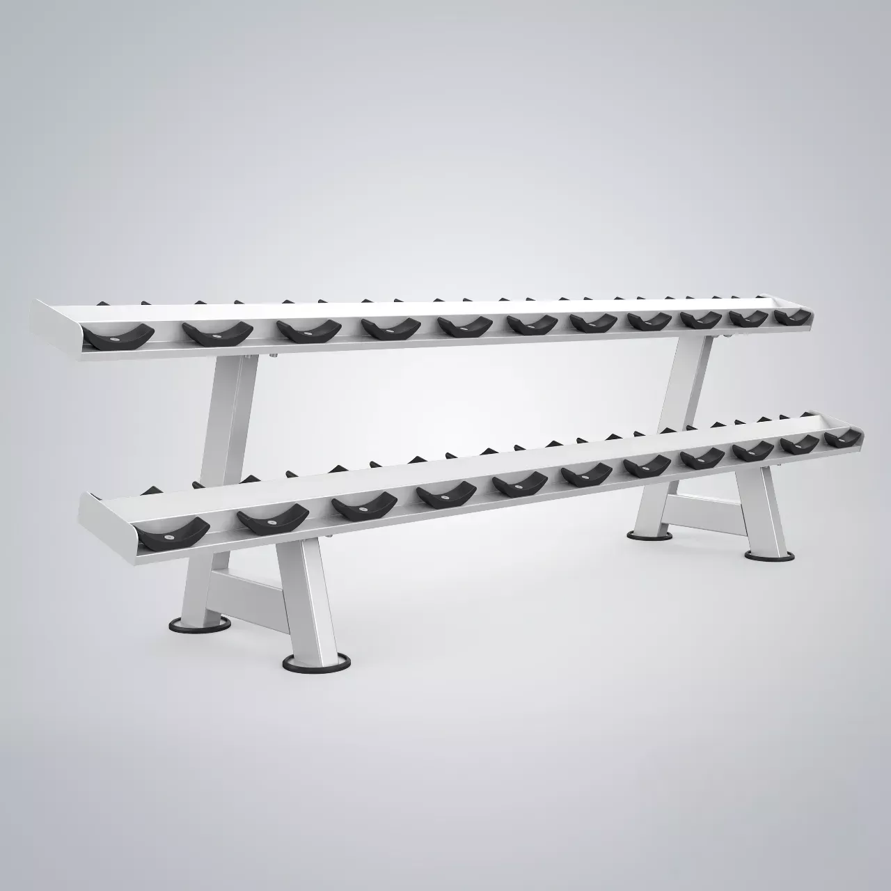 ชั้นวางดัมเบล 2 ชั้น มาตรฐาน Commercial ขนาดใหญ่ รองรับดัมเบลหลายคู่ พื้นเอียงช่วยให้หยิบง่าย แข็งแรง และเหมาะสำหรับฟิตเนสที่มีผู้ใช้งานจำนวนมาก