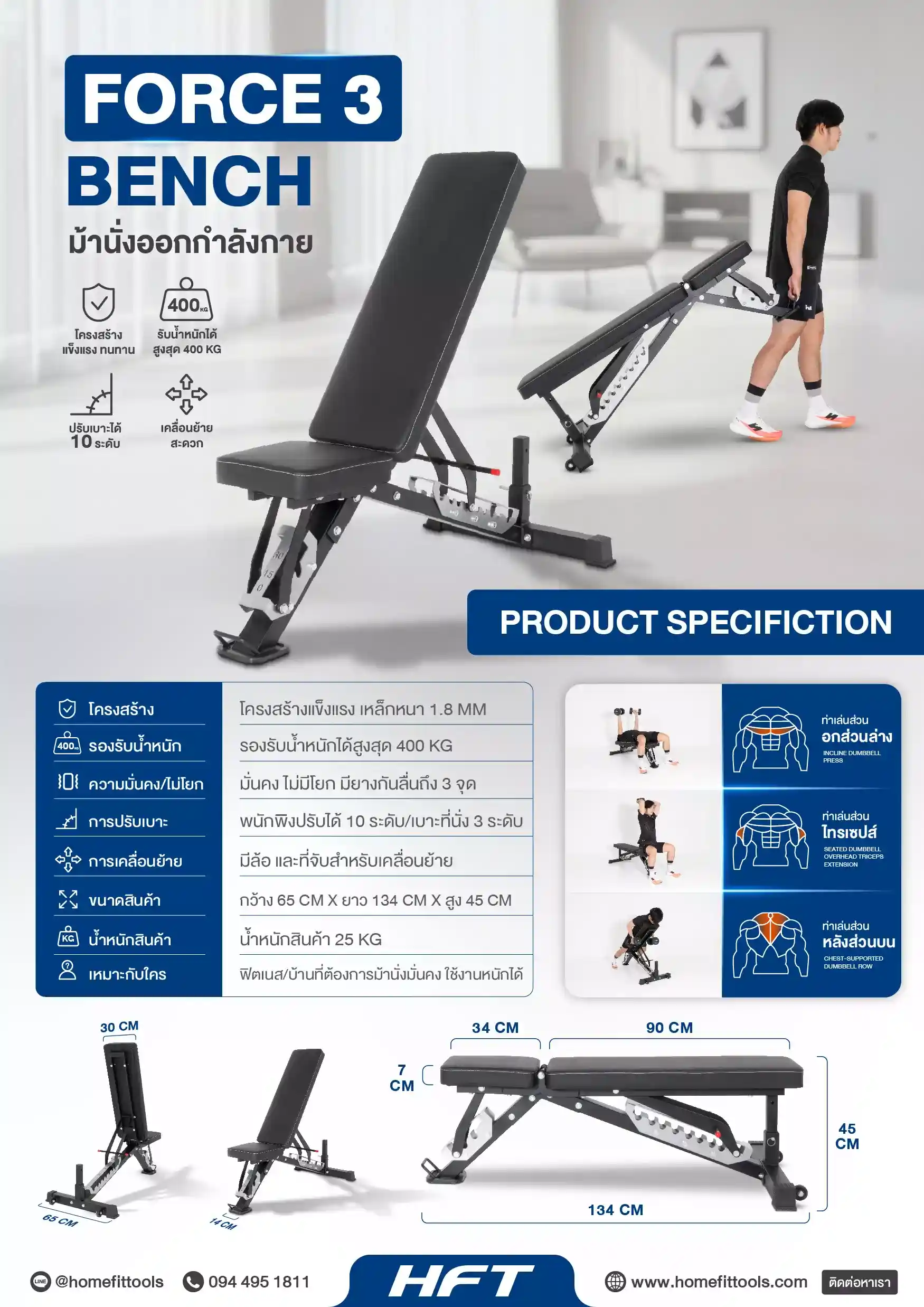 FORCE 3 ถูกพัฒนาโดยอิงจากการใช้งานจริงของคนออกกำลังกายที่บ้านและในฟิตเนสขนาดเล็ก เพื่อให้ได้ม้านั่งที่ “ครบ” ทั้งฟังก์ชัน ปรับได้หลายระดับ เบาะหนานั่งสบาย และมีความมั่นคงทุกองศา