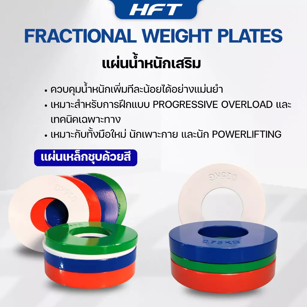ชุดแผ่นน้ำหนักเสริม Fractional Weight Plates ขนาด 2 นิ้ว จาก Homefittools ถูกออกแบบเพื่อให้การเพิ่มน้ำหนักในการฝึกเวทเป็นไปอย่างละเอียดและแม่นยำ เพิ่มน้ำหนักทีละเล็กทีละน้อย (Micro Loading) เหมาะสำหรับผู้ที่ฝึก Progressive Overload นักเพาะกายมือใหม่ นัก Powerlifting หรือผู้ที่ต้องการเพิ่มน้ำหนักทีละน้อยโดยไม่กระโดดแรงเกินไป