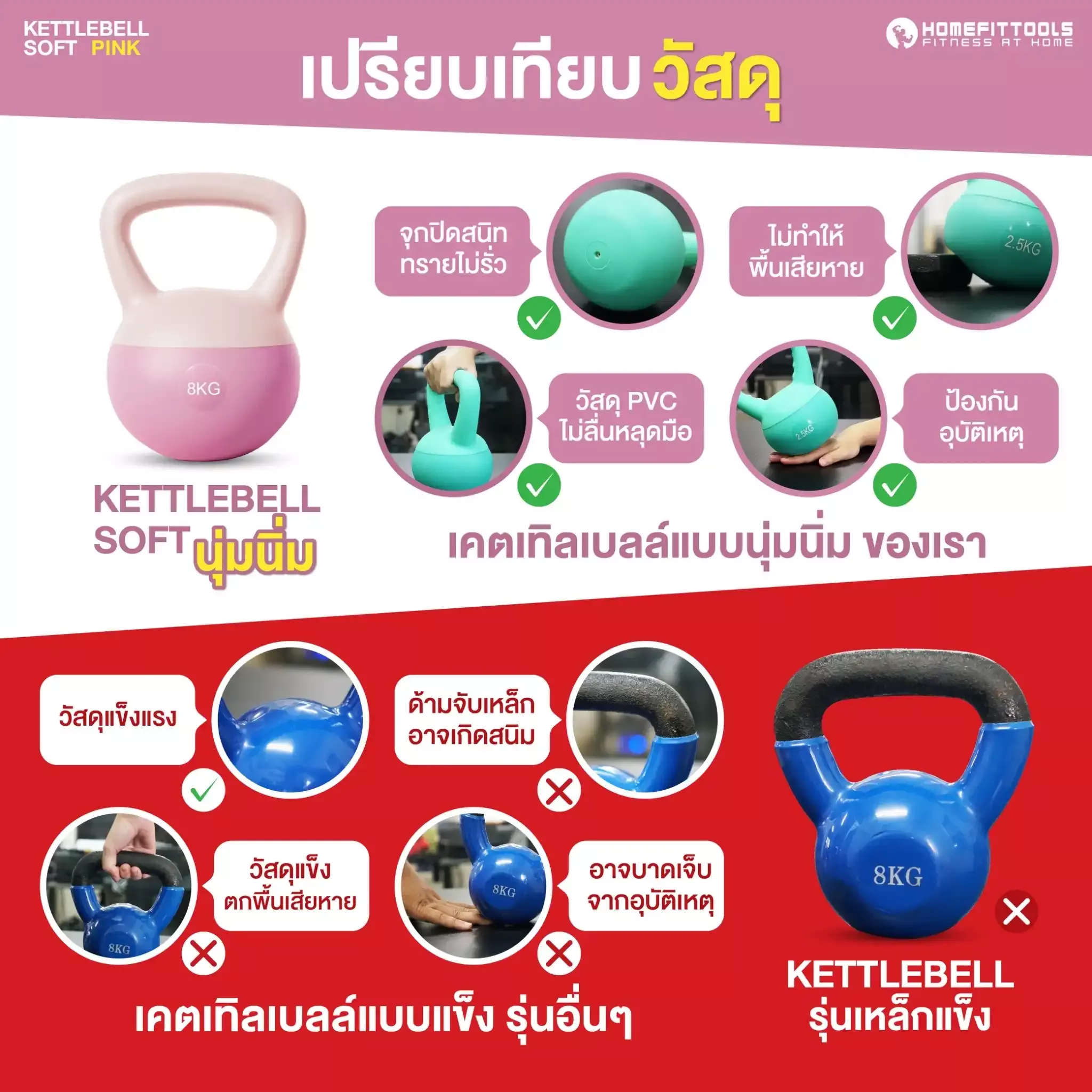 ✅ นวัตกรรม PVC แบบอ่อนนุ่มพิเศษ หุ้มฐานเคตเทิลเบล ช่วยลดแรงกระแทกและป้องกันความเสียหายต่อพื้นผิว