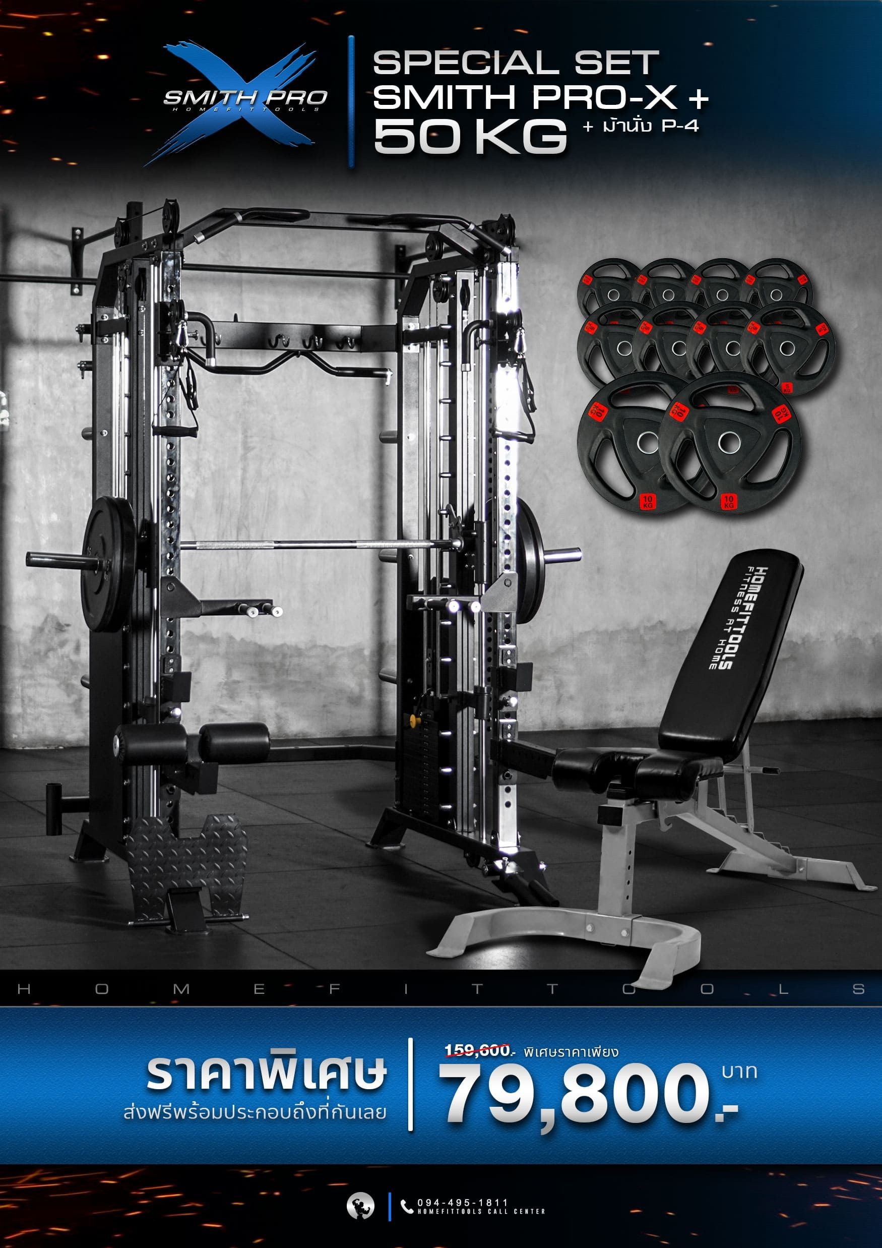 Smith Machine สมิทแมชชีน PROX + แผ่นน้ำหนักชุด 50 กิโล + ม้านั่ง P4 | Homefittools